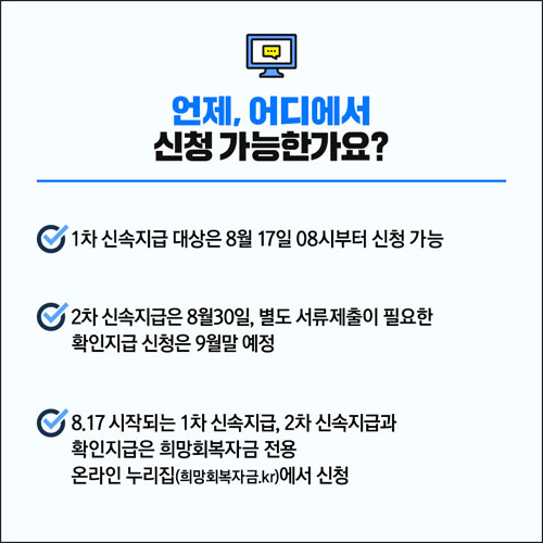 이 외에 궁금한 사항은 희망회복자금 콜센터(1899-8300)나 '희망회복자금114.kr' 홈페이지의 온라인 채팅상담 기능을 통해 문의가 가능하다고 합니다. 참고하셨으면 합니다.