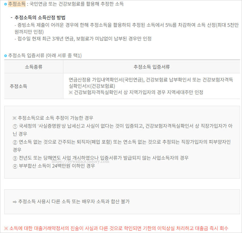 추정소득의 소득산정 방법과 주택금융공사 디딤돌대출 서류 중 추정소득 입증서류 안내입니다. 추정소득으로 소득 추정이 가능한 경우를 확인할 수 있습니다. 다만 추정소득 사용시 다른 소득 또는 배우자 소득과 합산을 불가합니다.