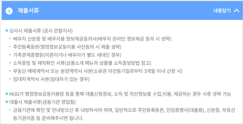▣ HUG가 행정정보공동이용망 등을 통해 대출신청정보, 소득 및 자산정보를 수집,이용, 제공하는 경우 서류 생략 가능합니다.