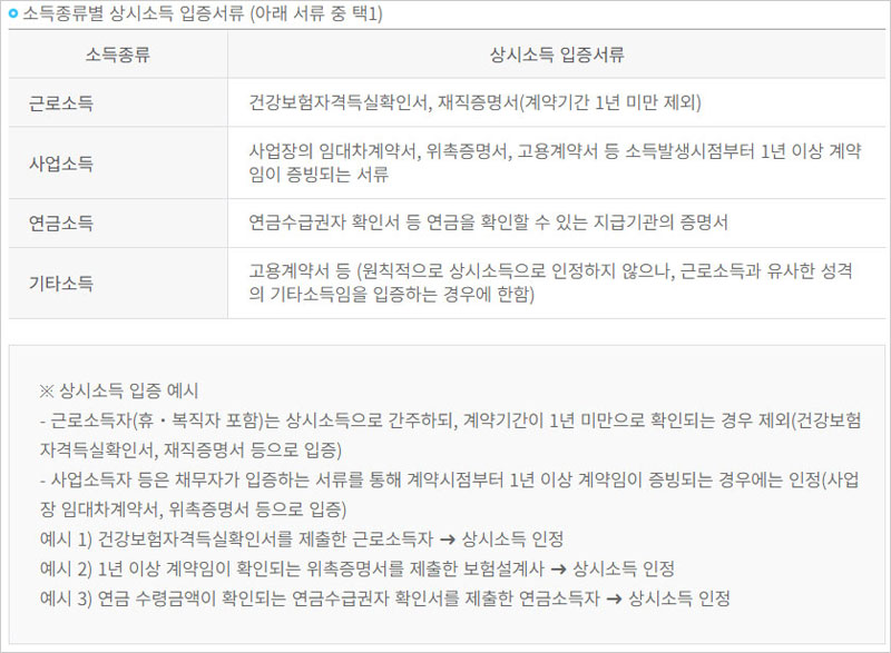 주택금융공사 디딤돌대출 서류 중 소득 종류별 상시소득 입증 서류 안내입니다. 상시소득 입증 예시 사항을 확인할 수 있습니다.