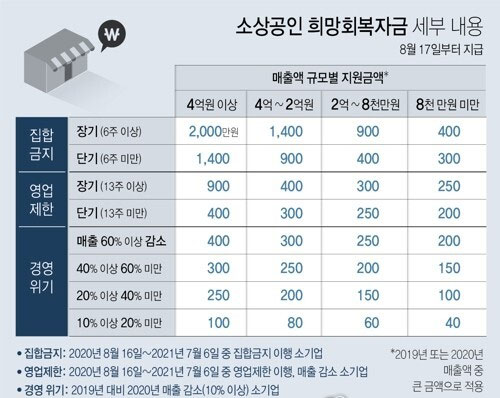 5차 재난지원금 집합금지 업종 구간별로 매출액 2억~4억원은 1400만원, 매출액 8000만원에서 2억원은 900만원, 매출액 8000만원 미만은 400만원의 희망회복자금이 지원됩니다. 매출액은 2019년이나 2020년 중 큰 금액으로 적용됩니다.