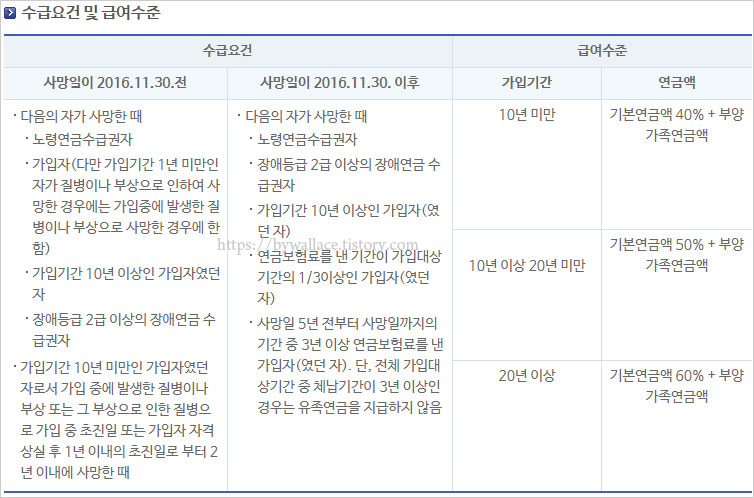 ※ 2016.11.30. 이후 사망자 중 연금보험료를 낸 기간이 가입대상 기간이 1/3이상인 가입자(였던 자) 및 사망일 5년 전부터 사망일까지의 기간 중 3년 이상 연금보험료를 낸 가입자(였던 자)는 사망일이 타공적연금 가입기간이나 내국인의 국외이주 또는 국적상실 기간 및 외국인의 국외거주기간 중에 있는 경우는 유족연금을 지급하지 않습니다.