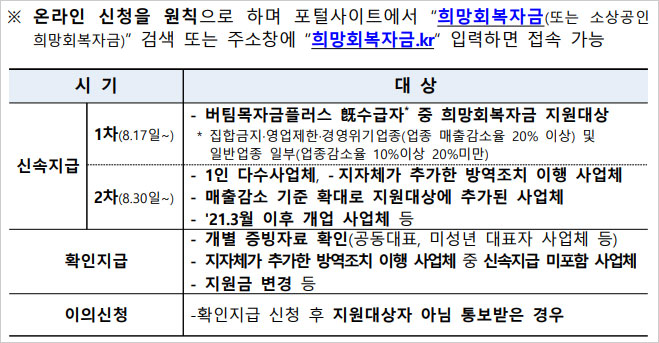 참고로 희망회복자금 지원대상이나 신속지급 대상에 포함되지 않은 소기업 및 소상공인들을 위해서는 9월30일부터 확인지급이 진행될 예정이라고 합니다.