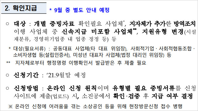 공동대표 사업체(위임장), 사회적기업·협동조합(사회적기업 인증서, 협동조합설립 신고확인증 등) 지자체에서 방역조치 이행확인서를 발급받은 사업체, 업종분류 재확인 희망 업체 등이 확인지급을 신청할 수 있습니다. 확인지급의 대상과 요건, 필요 증빙서류, 신청 시기, 방법 등 자세한 사항은 9월 중에 별도로 안내할 계획이라고 합니다.