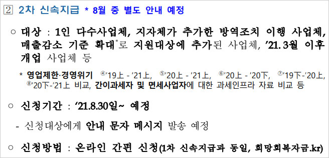 집합금지 및 영업제한을 이행했으나 지자체의 절차 지연 등으로 1차 신속지급에 포함되지 않았던 2500개 업체도 이번 소상공인 희망회복자금 2차 대상자에 포함되어 지원됩니다. 1차 신속지급으로 지원받았으나 지원금 상향이 필요한 사업체(2만8000개)는 별도 신청없이 9월6일부터 차액을 지급받게 된다고 합니다.