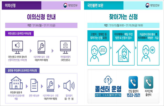 국민지원금 이의신청은 9월 6일부터 온라인 국민신문고나 주소지 읍면동 주민센터에서 접수가 가능합니다. 작년에는 읍면동 주민센터에서 오프라인 신청만 받았으나 이번에는 온라인 신청도 가능하다고 합니다.