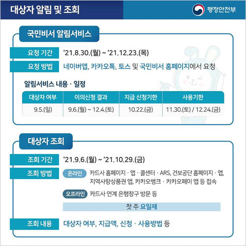 참고로 국민지원금 지급시기는 9월 6일부터 10월 29일까지라고 합니다. 국민지원금 신청은 내달 9월 6일부터 온라인을 통해 신청이 가능합니다. 또한 9월 13일부터는 오프라인 신청이 시작되며 10월 29일에 마감된다고 합니다.
