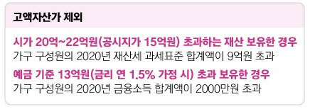 다만 국민지원금 조건 중 기본 또는 특례 선정기준에 부합하더라도 가구 구성원의 2020년 재산세 과세표준 합계액이 9억원 초과하거나 가구 구성원의 20년 금융소득 합계액이 2000만원 초과일 경우 지급 대상에서 제외된다고 합니다.