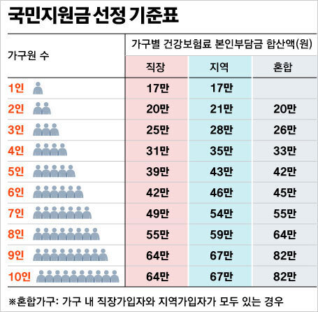 직장 가입자와 지역 가입자가 한 가구에 함께 있는 경우 혼합 가입자 기준을 적용한다고 하는데요. 예를 들어 남편은 직장에 다니고 아내는 프리랜서인 맞벌이 4인 가구의 경우에는 혼합 가입자로 분류돼 지원금 지급 기준선이 42만원으로 책정된다고 합니다.