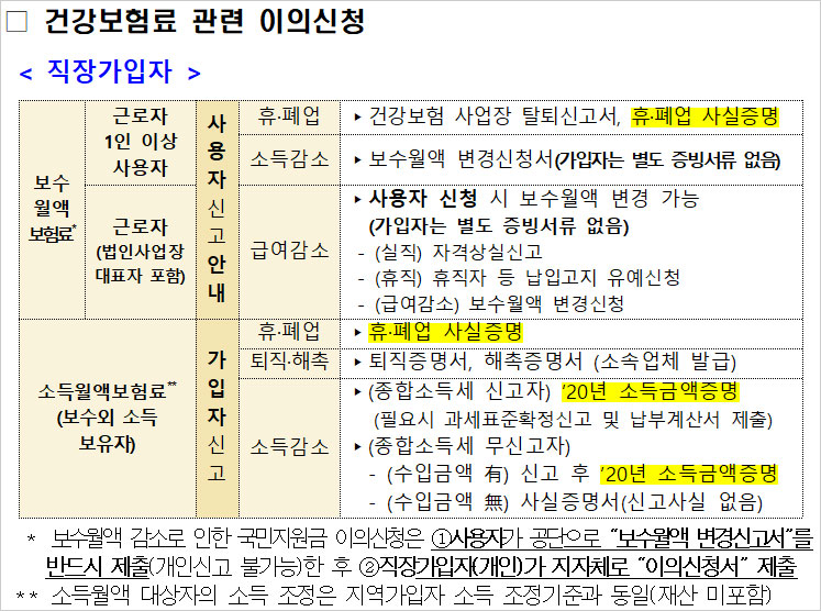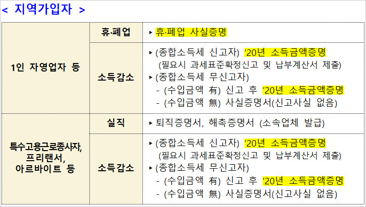 5차 재난지원금 이의신청 서류 중 직장 가입자 및 지역가입자 건강보험료 관련 이의신청 서류는 아래와 같다고 합니다.
