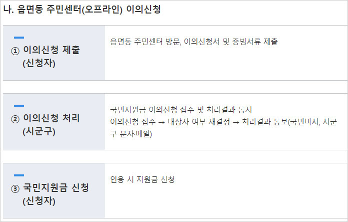 5차 재난지원금 이의 신청 방법 중 읍면동 주민센터를 통한 이의신청 절차에 대해 알아보면 이의 신청자가 읍면동 주민센터를 방문 해 이의신청서 및 증빙서류를 제출합니다. 이후 시군구에서 이의신청서를 접수해 대상자 여부를 재결정하고 처리결과를 통보해 준다고 합니다.