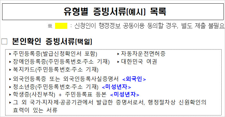 5차 재난지원금 이의신청 서류 중 본인확인 증빙서류 및 대리신청시 필요서류는 위와 같다고 합니다. 증빙서류 중 노란색 표시가 있는 서류는 신청인이 행정정보 공동이용에 동의할 경우 별도 제출할 필요가 없다고 합니다.
