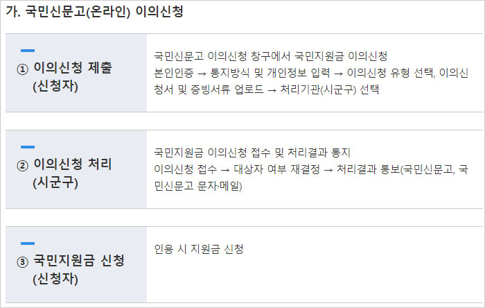 5차 재난지원금 이의 신청 방법 중 국민신문고 온라인 이의신청 절차에 대해 알아보면 먼저 신청자가 국민신문고 이의신청창구에서 국민지원금 이의신청을 하면 됩니다. 본인인증 후 통지방식 및 개인정보를 입력합니다. 이의신청 유형을 선택하고 이의신청서 및 증빙서류를 업로드 합니다. 처리기관을 선택합니다. 이후 이의 신청 처리기관에서 대상자 여부를 결정하고 처리결과를 통보해 준다고 합니다.