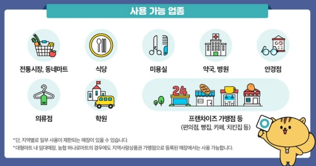 국민지원금 사용처는 전통시장 및 동네 슈퍼마켓, 식당, 미용실, 약국, 안경원, 의류점, 병원 등이라고 합니다. 논란이 됐던 학원도 지역사랑상품권 가맹점이라면 국민지원금 사용처로서 사용할 수 있다고 합니다.