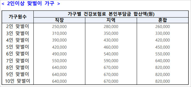 맞벌이 가구는 가구원 수를 1명 더 추가한 기준을 적용한다고 합니다. 예를 들어 2인 맞벌이 가구면 3인 가구로, 3인 맞벌이 가구면 4인 가구로 보고 이에 해당하는 건보료 기준액을 적용한다고 합니다. 다만 지역가입자는 지난해 종합소득이 300만원 이상인 경우만 맞벌이로 인정한다고 합니다.