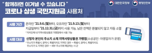 ※ (지역온라인몰) 온통대전몰, 인천직구, 부산 동백몰 등(지역배달앱) 제로배달 유니온(서울), 배달의 명수(군산), 배달특급(경기),배달서구(인천), 대구로(대구) 등은 5차 재난지원금 사용이 가능합니다.