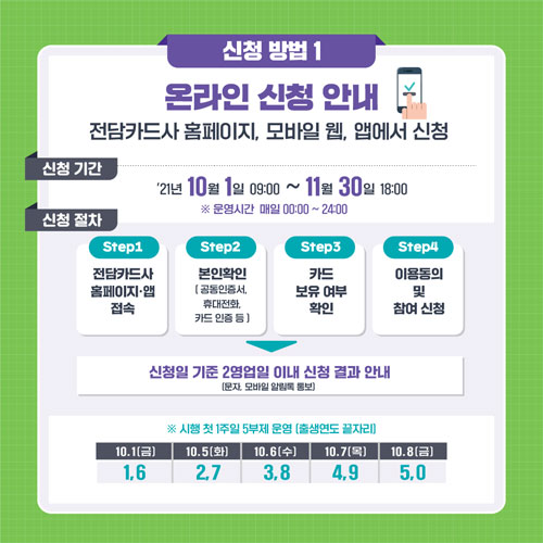 ▶ 신청 기간: 2021. 10. 1(금) 9:00 ~2021. 11. 30(화) 18:00, 온라인 신청 가능시간: 00:00~24:00 (단, 23:30~00:30 신청 불가)