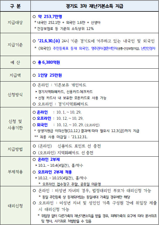 경기도는 지난 6월 30일 24시 기준 경기도에 거주하는 내국인과 외국인 가운데 정부의 재난지원금 지급대상에서 제외된 소득상위 12%에게 1인당 25만 원을 지급합니다. 경기도 거주 내국인 252만1,000명, 외국인 1만6,000명 등 총 253만7000명이라고 합니다.
