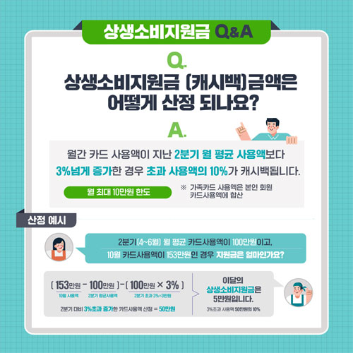 ※ (예시) 2분기 월평균 사용액이 100만원이고 10월 카드사용액이 153만원인 경우, 증가액 53만원 중 3만원(3%)을 제외한 50만원의 10%인 5만원 지급.