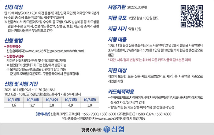 이상은 10월 1일부터 신청 접수를 받는 상생 소비지원금 카드 캐시백 신청 방법과 관련해 BC비씨카드 신용협동조합 신협 상생소비지원금 신청 방법과 더불어 카드 캐시백 산정 및 조회, 사용방법과 상생소비지원금 사용처 등에 대해 간단정보였습니다. 참고하셨으면 좋겠습니다.