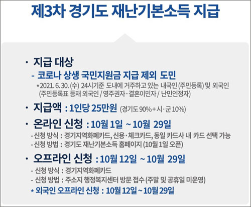외국인의 경우 정부 상생 국민지원금과 동일한 자격기준이 적용된다고 합니다. 결혼이민자, 영주권자, 난민인정자, 그리고 내국인이 1인 이상 포함된 세대의 주민등록표에 등재된 자 가운데 정부 상생 국민지원금 지급대상에서 제외된 경우 3차 경기도 재난지원금이 지급된다고 합니다. 외국인은 10월 12일부터 10월 29일까지 읍면동 행정복지센터에서 현장 신청만 가능하다고 합니다.
