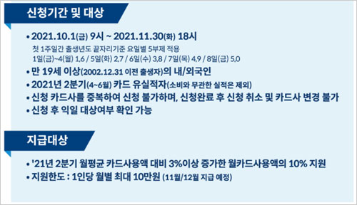 ▶ 21.10월 ~ 11월까지 2개월간 시행예정이며, 사업현황에 따라 시행기간이 조정될 수 있습니다. 참고로, 10월 카드사용에 대한 지원금은 11월 15일, 11월 카드사용액에 대한 지원금은 12월 15일에 배정 예정입니다.