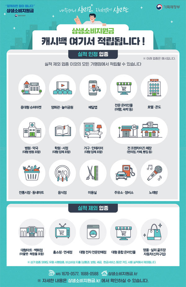 상생소비지원금 사용처에 대해 알아보면 중대형 슈퍼마켓, 영화관, 배달앱, 전문온라인몰, 공연, 대형 병원·서점·학원, 프랜차이즈 직영점 등도 인정된다고 합니다. 또한 '대형 종합 온라인몰'을 포함한 '실적적립 제외 업종' 이외의 모든 인터넷 거래는 실적적립이 가능하다고 합니다.