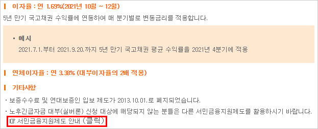 국민연금 실버론 대출 이자 및 금리는 연 1.69% (2021년 10월 ~ 12월)가 적용된다고 합니다. 실버론 이자율은 5년 만기 국고채권 수익률에 연동하여 매 분기별로 변동금리가 적용된다고 합니다.