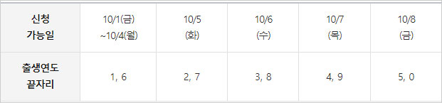 ▶ 2021.10.1~10.8 동안은 5부제로 운영(출생연도 끝자리 기준)되며, 10.9부터는 요일에 관계없이 신청 가능합니다.