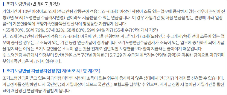 단, 국민연금 조기수령나이 및 조건에서 55세(수급연령 상향규정 적용 : 55~60세) 이후에 연금을 신청하여 지급받다가 60세(노령연금 수급개시연령) 전에 소득이 있는 업무에 종사할 경우에는 그 소득이 있는 기간 동안 연금 지급이 정지된다고 합니다.
