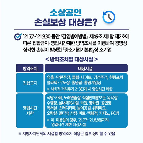 소상공인 손실보상금 대상 및 기준에 대해 알아보면 2021년 7월 7일부터 2021년 9월 30일까지 집합금지, 영업시간 제한 방역조치를 이행해 경영상 심각한 손실이 발생한 소기업이 대상이라고 합니다. 2021년 10월 1일 이후 손실은 내년 예산으로 편성해 보상할 계획이라고 합니다. 소상공인 재난지원금을 지급받지 못했던 폐업자도 폐업일 직전까지 발생한 손실을 보상받을 수 있다고 합니다.