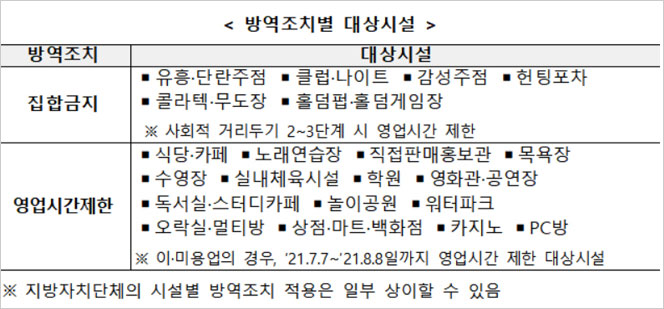 영업시간 제한 대상으로는 식당 및 카페, 노래연습장, 직접판매홍보관, 목욕장, 수영장, 실내 체육시설, 학원, 영화관 및 공연장, 독서실 및 스터디카페, 놀이공원, 워터파크, 오락실 및 멀티방, 상점 및 마트, 백화점, 카지노, PC방 등이 있다고 합니다.
