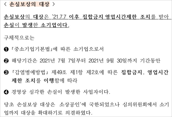 소상공인 손실보상금 대상은 올해 7월7일~9월30일 동안 '감염병예방법' 제49조 제1항 제2호에 따른 집합금지 및 영업시간제한 방역조치를 이행해 경영상 심각한 손실이 발생한 '중소기업기본법'상 소기업이라고 합니다.