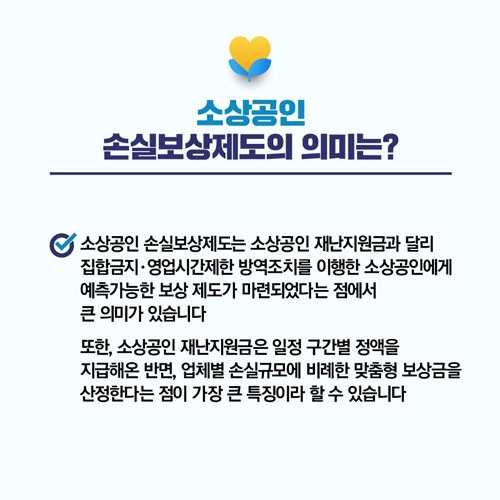소상공인 손실보상제도란 정부의 지침에 따라 집합금지, 영업시간 제한, 방역조치 등을 이행한 소상공인에게 주는 보상제도라고 합니다. 일정 구간별 정액을 지급한 재난지원금과는 달리 업체별 손실규모에 비례한 맞춤형 보상금을 지급할 예정이라고 합니다.