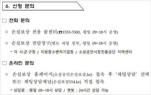 소상공인 손실보상금 대상 및 신청 방법 등과 관련된 정보는 소상공인 손실보상 콜센터(1533-3300) 또는 지방중소벤처기업청, 소상공인시장진흥공단 지역센터 등을 통해서도 자세하게 안내받을 수 있다고 합니다. 손실보상 홈페이지(소상공인 손실보상.kr) 접속 후 채팅상담을 선택하거나 채팅상담채널(손실보상114.kr)을 직접 접속해 상담 및 문의가 가능하다고 합니다.