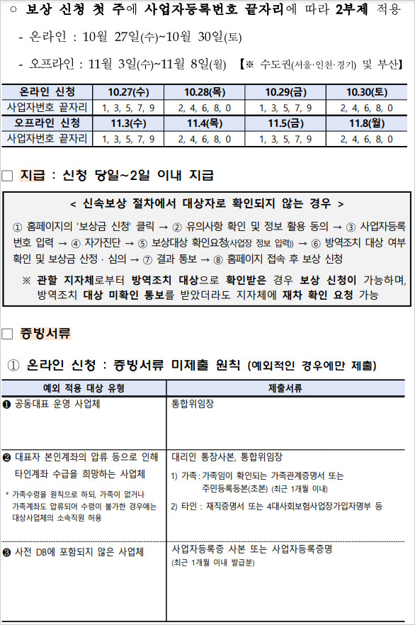 10월 27일부터 소상공인 손실보상금 신청 홈페이지(소상공인손실보상.kr)에서 사업자번호를 입력하고 본인인증을 한 소상공인 및 소기업은 별도 증빙서류 없는 간편 신청을 통해 2일 이내에 산정된 보상금을 지급받을 수 있다고 합니다.
