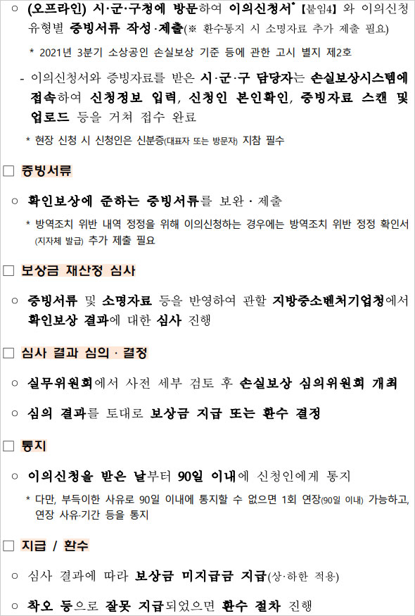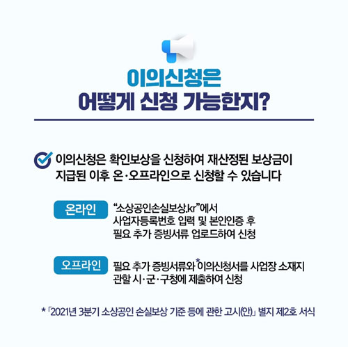 오프라인은 필요한 추가 증빙서류와 이의신청서(2021년 3분기 소상공인 손실보상 기준 등에 관한 고시(안) 별지 제2호 서식)를 사업장 소재지 관할 시, 군, 구청에 제출해 신청해야 합니다.