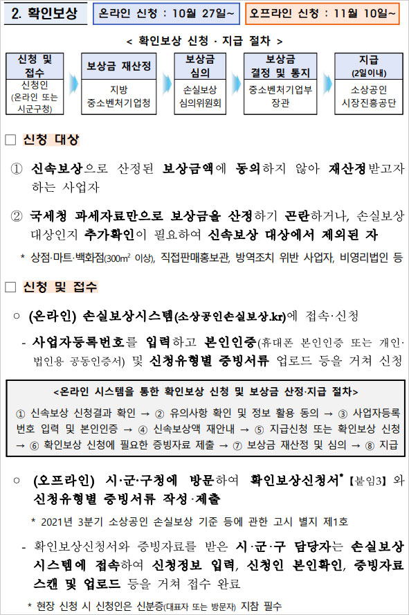 소상공인 신속보상 금액에 동의하지 않는 사업체는 증빙서류를 제출해 보상금을 다시 산정하는 확인보상(신속보상금에 부동의한 경우, 지방자치단체 시설분류 확인이 필요한 경우 등) 절차를 거치게 된다고 합니다. 확인보상의 경우, 온라인 및 오프라인 모두 11월 10일부터 신청할 수 있다고 합니다.
