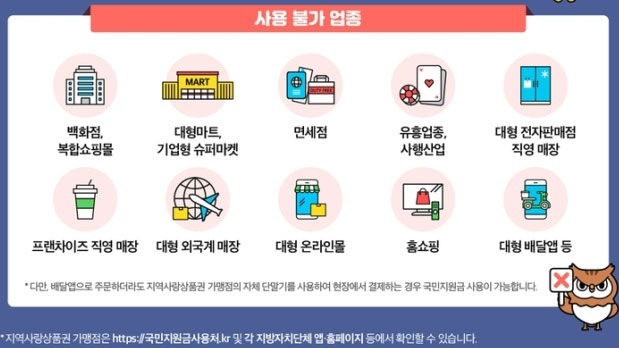 또 쿠팡 및 11번가 등 대형 온라인몰과 배달의민족, 요기요 등 대형 배달앱에서도 사용이 불가능합니다. 다만 배달앱으로 주문하더라도 현장결제를 하여 입점매장의 자체 결제단말기를 사용하는 경우는 가능하다고 합니다.