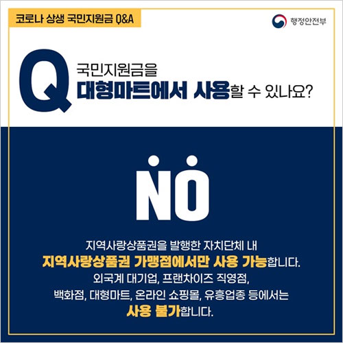 ※ (지역온라인몰) 온통대전몰, 인천직구, 부산 동백몰 등(지역배달앱) 제로배달 유니온(서울), 배달의 명수(군산), 배달특급(경기),배달서구(인천), 대구로(대구) 등은 긴급재난지원금 사용이 가능합니다.