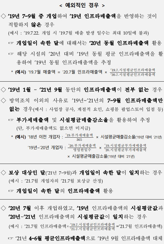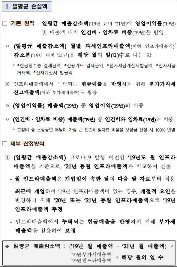 예를 들어 2019년 8월 일평균 매출액이 200만원이던 사업장의 2021년 8월 일평균 매출액이 150만원으로 줄었다면 일평균 매출감소액은 50만원이라고 합니다. 이 사업장의 2019년 영업이익률이 10%이며 같은 해 매출액 대비 인건비 및 임차료 비중이 25%라면 일평균 손실액은 50만원×(0.10+0.25)으로 계산해 17만5000원이 된다고 합니다.