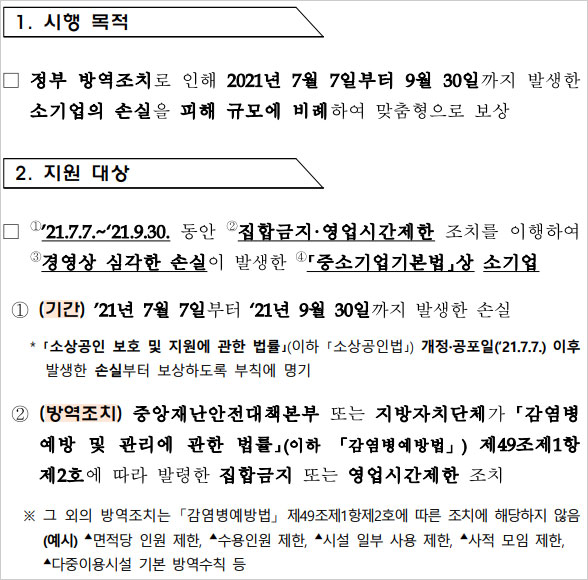 소상공인 손실보상 대상에 대해 알아보면 2021년 7월 7일부터 2021년 9월 30일까지 집합금지, 영업시간 제한 방역조치를 이행해 경영상 심각한 손실이 발생한 소기업이 대상이라고 합니다. 소상공인 재난지원금을 지급받지 못했던 폐업자도 폐업일 직전까지 발생한 손실을 보상받을 수 있다고 합니다.
