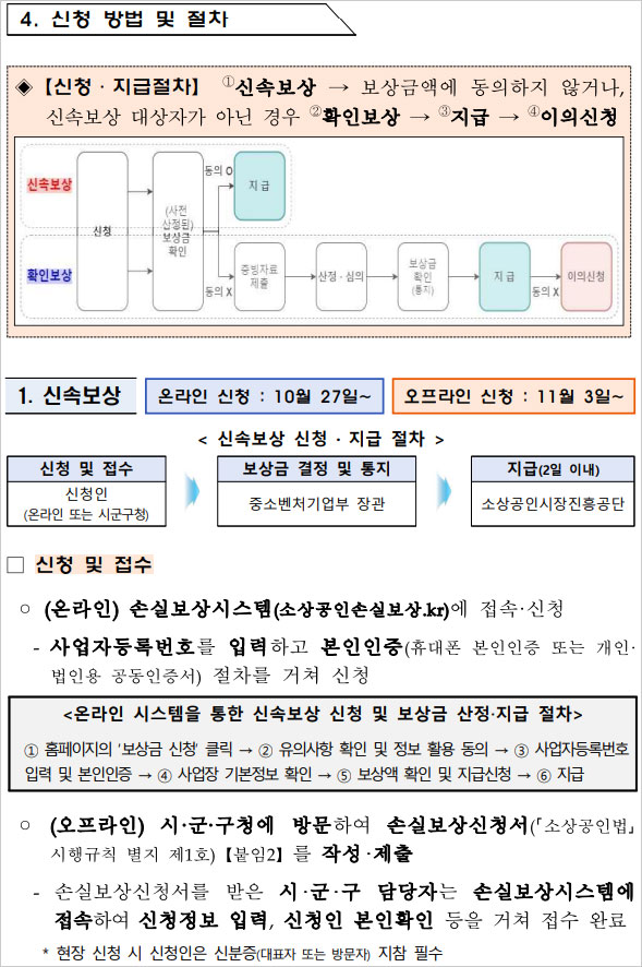 소상공인 손실보상금 신속보상의 경우, 온라인으로는 10월 27일부터 오프라인으로는 11월 3일부터 신청할 수 있다고 합니다. 또한 신속보상으로 신청한 경우 보상금은 2일 이내에 수령할 수 있다고 합니다.