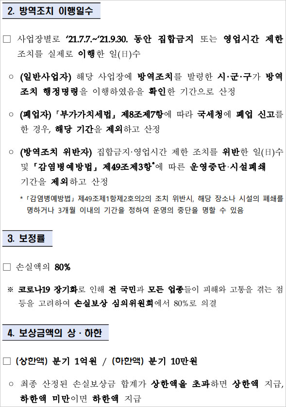 방역조치이행일수는 지난 7월 7일부터 9월 30일 사이 사업자가 집합금지 및 영업시간제한 방역조치를 이행해 지방자치단체가 확인한 기간을 의미합니다. 보정률은 집합금지와 영업시간제한 조치별로 차등하지 않고 동일하게 80%를 적용한다고 합니다.