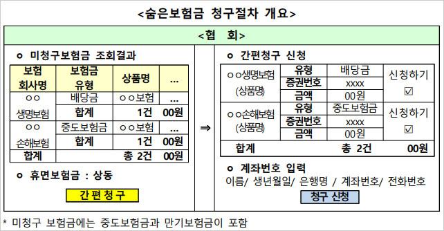 이번 숨은 보험금 및 휴면보험금 조회 서비스 개선으로 사이트에서 숨은 보험금을 조회한 뒤 원하는 항목을 모두 선택해 한 번에 청구할 수 있게 된다고 합니다. 조회된 회사 및 계약별 숨은 보험금 중 청구를 원하는 계약을 모두 선택해 한 번에 청구하는 방식이라고 합니다.