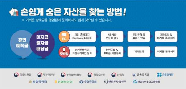 숨은 자산을 보유한 고객은 조합의 영업점을 직접 방문해 신청서를 작성한 후 자산을 수령할 수 있다고 합니다. 또한 금융결제원의 계좌정보통합관리서비스(어카운트인포 내계좌 한눈에)나 금융감독원의 금융소비자포털(파인)에서 자산을 조회하는 것도 가능하다고 합니다.