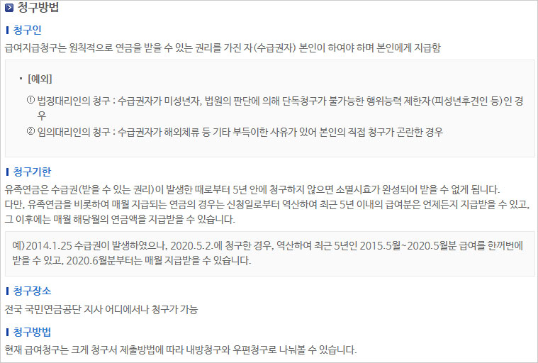 예) 2014.1.25 수급권이 발생하였으나, 2020.5.2.에 청구한 경우, 역산하여 최근 5년인 2015.5월~2020.5월분 급여를 한꺼번에 받을 수 있고, 2020.6월분부터는 매월 지급받을 수 있습니다.