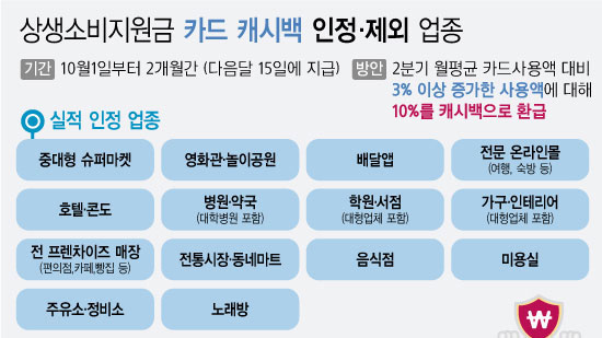 예를 들어 2분기 월평균 사용액이 100만원이고 10월 카드사용액이 153만원이라면 증가액 53만원 중 3만원(3%)을 제외한 50만원의 10%인 5만원을 지급받게 된다고 합니다. 상생소비지원금 시행 기간은 오는 10월부터 두 달간으로 1인당 월 최대 10만원, 두 달 동안 총 20만원을 환급받을 수 있다고 합니다.