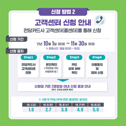 각 카드사는 자사고객에 대한 신청자격 점검(연령 및 실적) 후 대상자에게 신청자격 확인 및 신청방법을 안내한다고 합니다. 더불어 카드사 홈페이지, 앱, 콜센터 등을 통해서도 직접 확인 가능하다고 합니다.