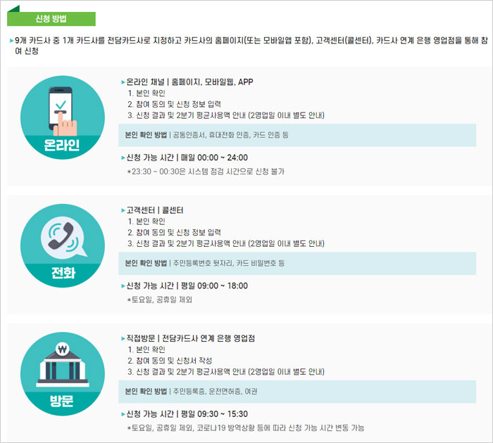 각 카드사는 자사고객에 대한 신청자격 점검(연령 및 실적) 후 대상자에게 신청자격 확인 및 신청방법을 안내한다고 합니다. 더불어 카드사 홈페이지, 앱, 콜센터 등을 통해서도 직접 확인 가능하다고 합니다.